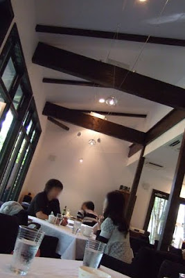 肝心のレストランも天井が高くて広々してます。真っ白な漆喰の塗り壁に、墨色の天然石が敷き詰められたフロア。天井の梁や窓枠のダークブラウンも潔くて気持ち良い。本格フレンチと和建築ってなんでこんなに落ち着くのかしらね。